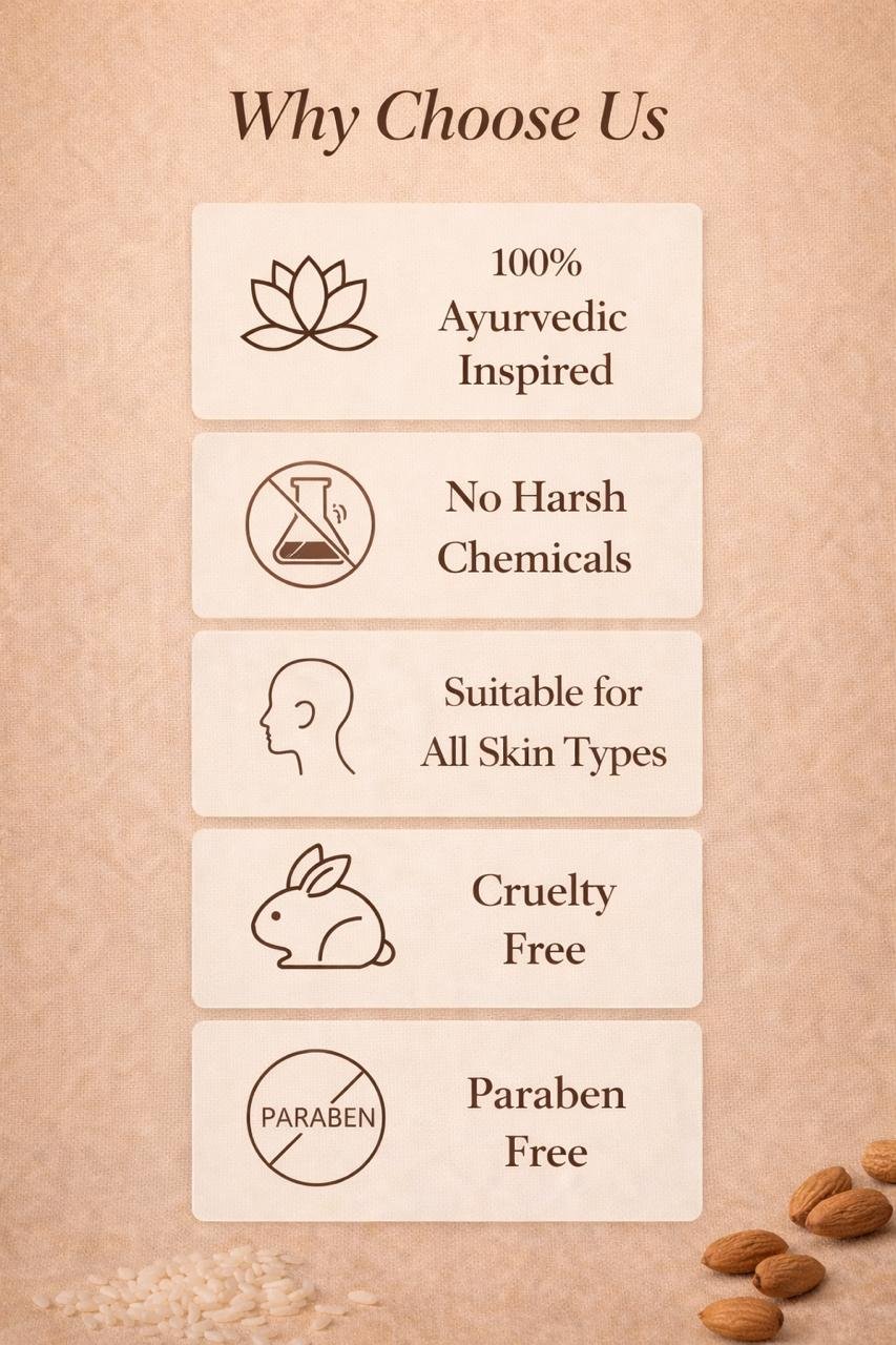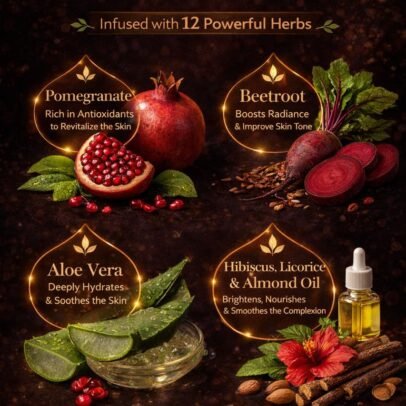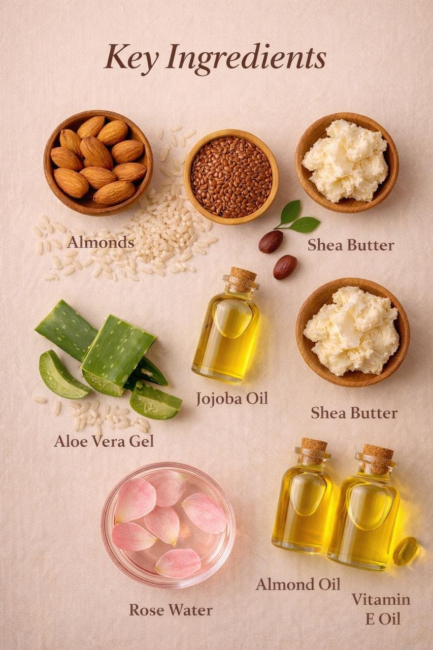 Almond, Rice , Flaxseed, Haleem seed, Shea butter, Rose water, Jojoba oil, Chia seed oil, Almond oil, Coconut oil, Vitamin e oil, Castor oil, Glycerin, Aloevera gel