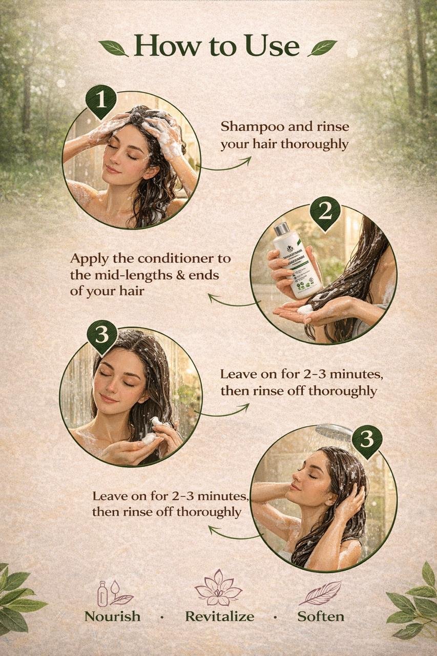 Our natural conditioner will work on hair fall, & thinning. Grows fresh hairs, Control dryness & frizziness, Detangles them easily and makes your hair softer & Shiner