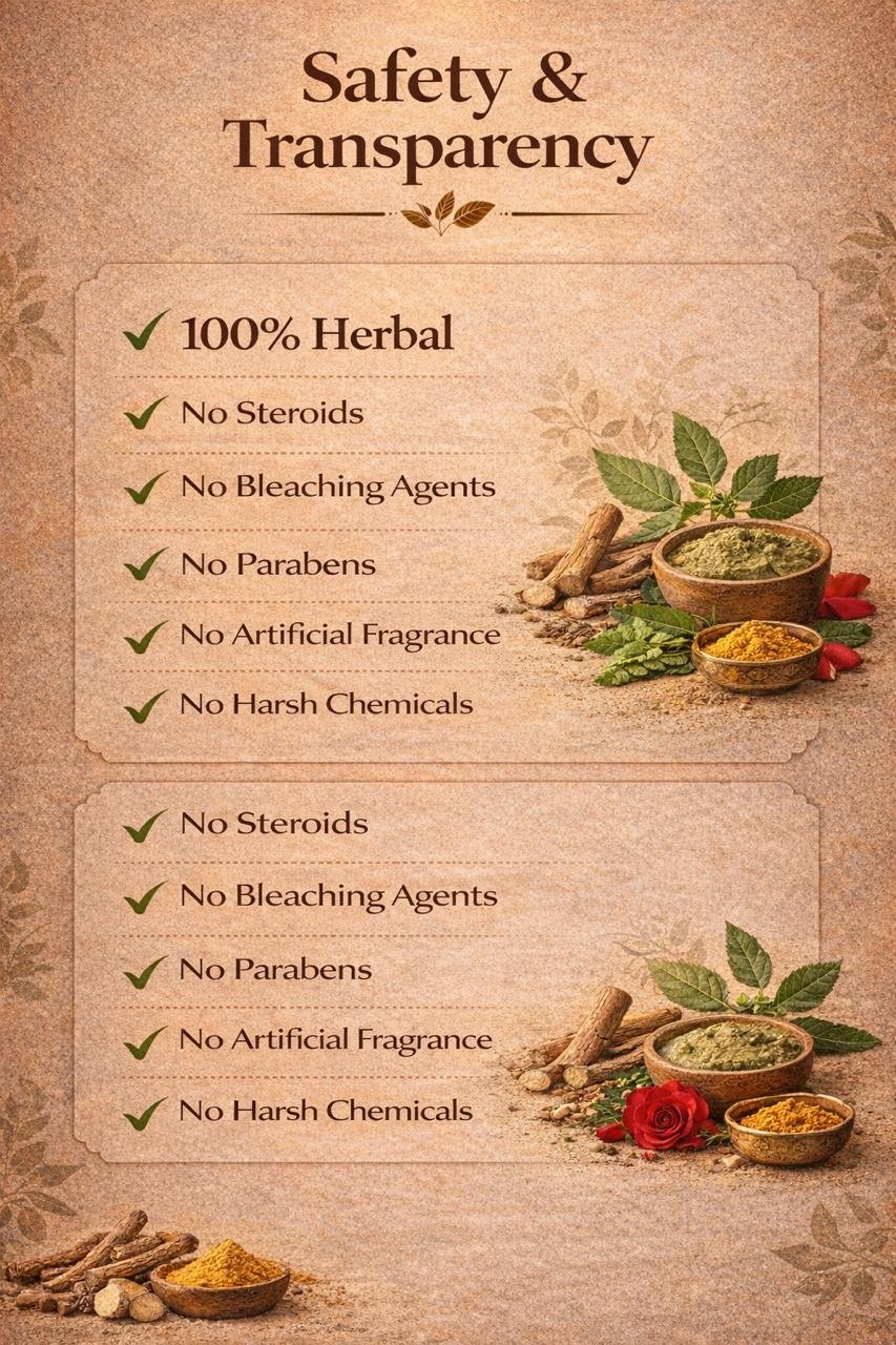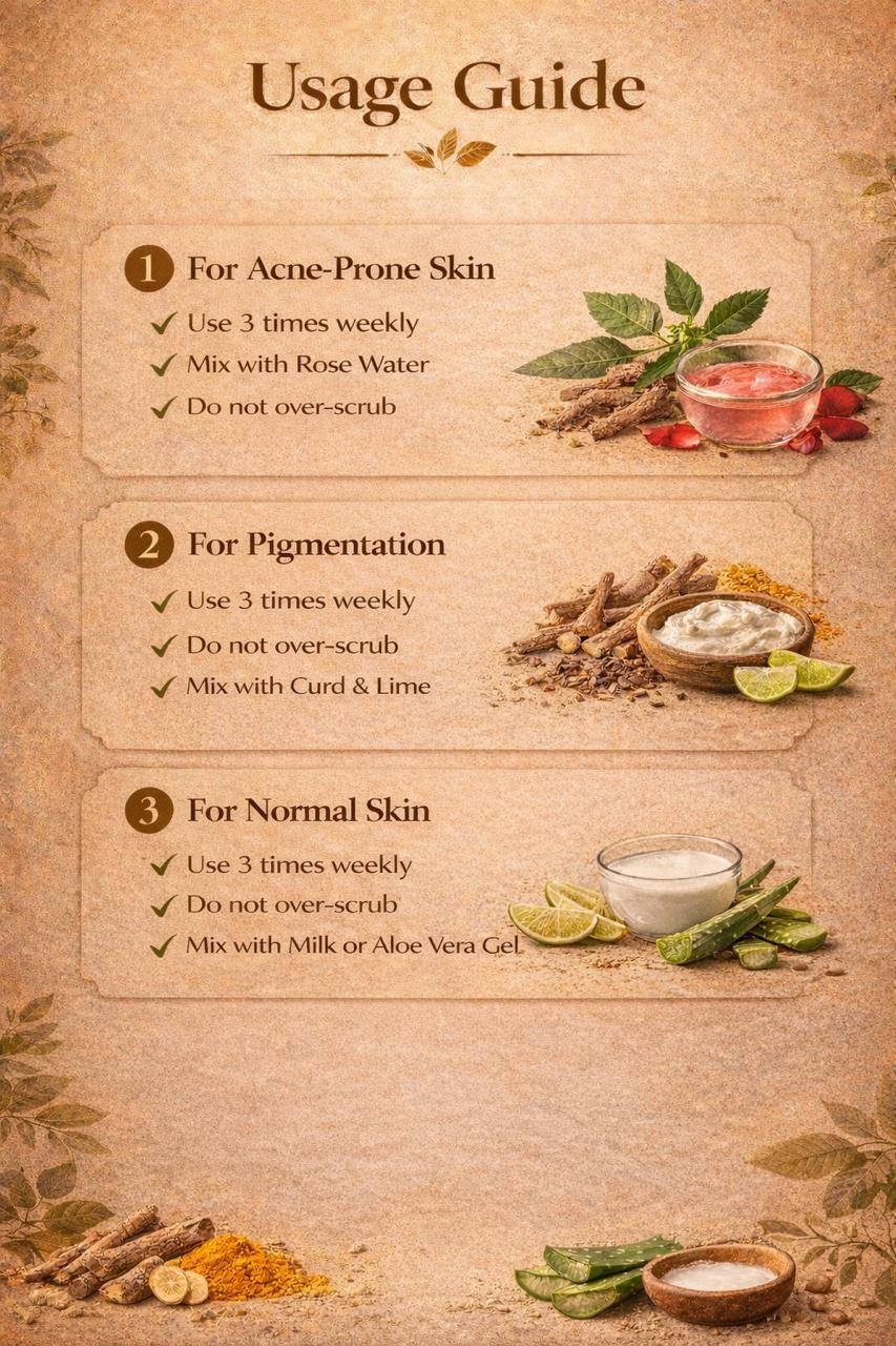 Manjishtha, Nagarmotha, Haleem seeds, Chickpea flour (Gram flour), Turmeric, Chandan (Sandalwood), Neem, Tulsi (Basil), Moringa, Ashwagandha, Rose, Hibiscus, Oats powder, Red lentils, Chia seeds, Coffee, Rice, Alum, Seafoam, Coconut milk, Orange, Flaxseeds, Almonds, Beetroot, Pomegranate, Nutmeg, Licorice, Ratanjot, Aprajita flower, Cocoa powder, Green lentils, Fuller’s earth.
